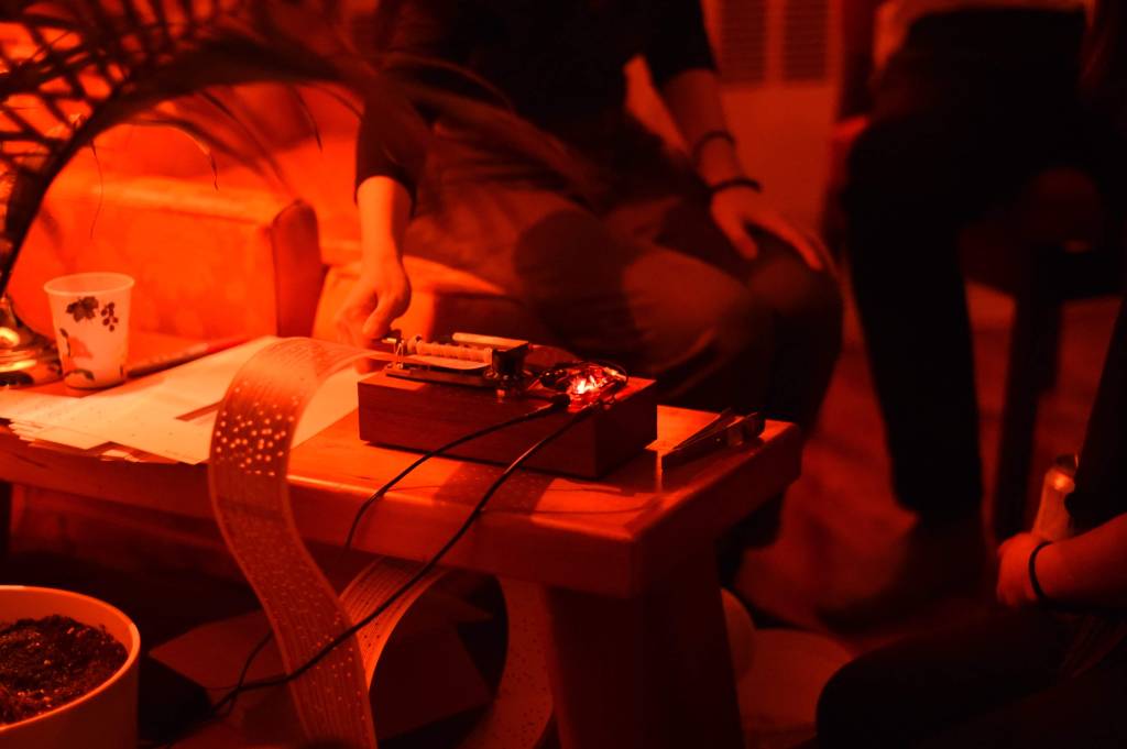 Sound sculpture using modified instruments, feedback and audience participation to generate compositions