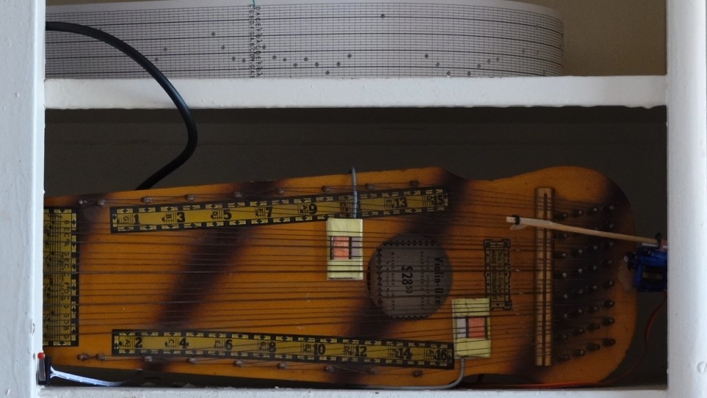 Zither, 2 servo motors, electromagnetic pickups and vibrational feedback